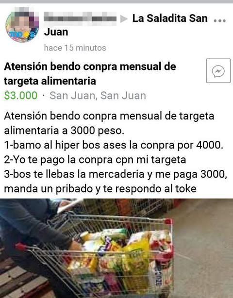 Indignación provocó la publicación de una mujer sanjuanina en un grupo de compra y venta de Facebook. Es que según ella misma publicó,  vende la compra mensual de su tarjeta alimentaria para recibir el dinero en efectivo.