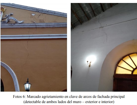 Según informaron desde el INPRES, "los estragos que ha provocado el efecto de la humedad en los viejos muros de adobe, en confluencia con el reciente sismo del 18 de enero de 2021, son evidentes (fotos 2 a 4). Se observan marcadas grietas en las claves de los arcos de la fachada principal y de los muros interiores, agrietamiento generalizado en el muro de fachada lateral, grietas que son visibles desde ambos lados de los muros, pudiéndose inferir que interesan el espesor completo del mismo (Fotos 5 a 6). Ya que los muros macizos son de hecho el principal recurso estructural; es innegable que el daño provocado por los sucesivos sismos, ha ido en detrimento de su capacidad resistente. Sin que pueda garantizarse su seguridad frente a eventos sísmicos venideros".