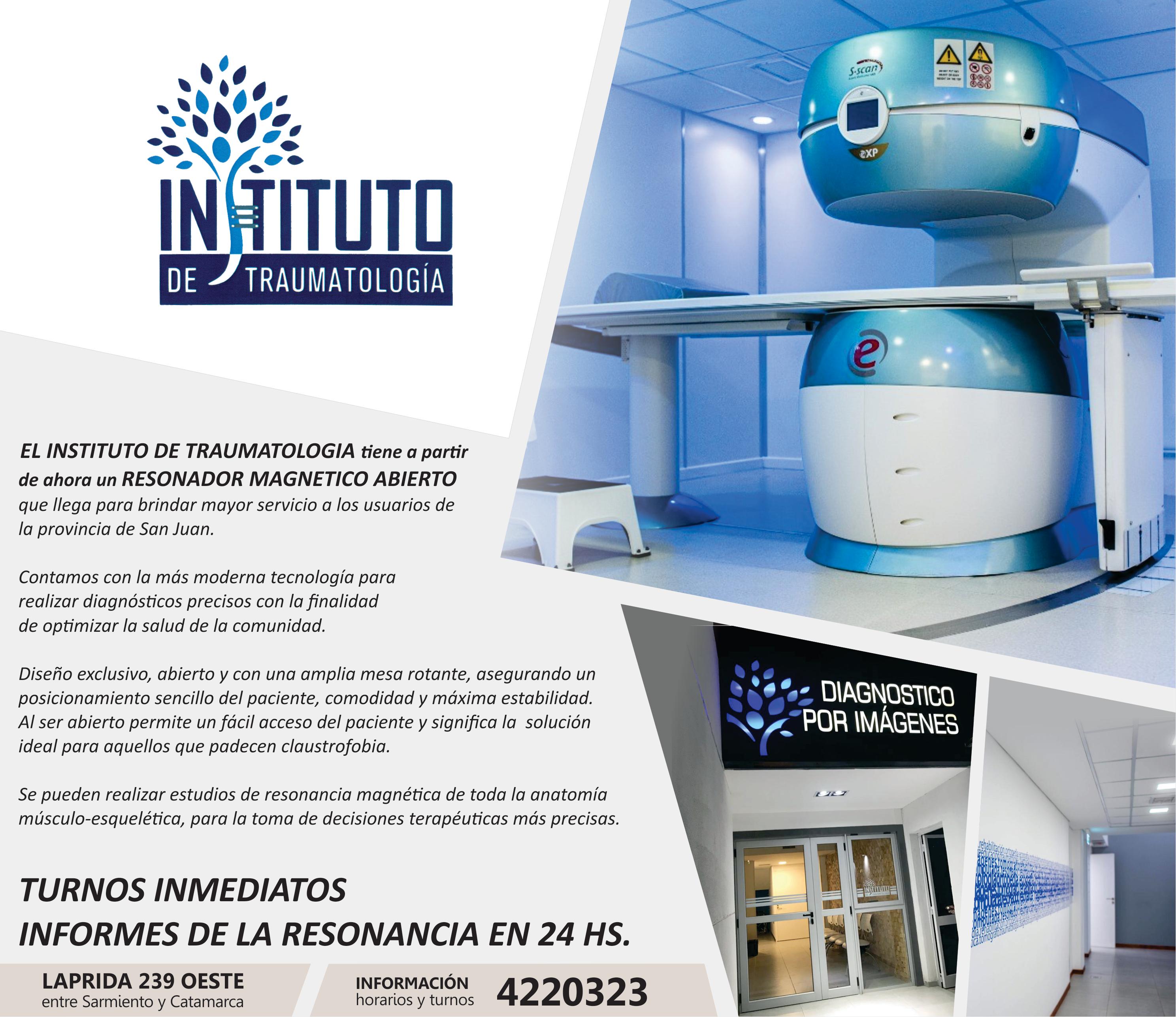 El Instituto de Traumatología ha invertido recientemente en la más moderna tecnología para realizar diagnósticos precisos en aras de optimizar la salud de la comunidad de San Juan. Representa una solución para que los pacientes ya no tengan que trasladarse a otras zonas más alejadas para poder realizar este tipo de exámenes o en días y horarios incómodos; para ello los turnos son dados de Lunes a Viernes y los informes entregados a los pacientes dentro de las 24 hs de realizado el estudio. Se trata de la adquisición de un nuevo y moderno resonador magnético Esaote S-Scan, de origen italiano.