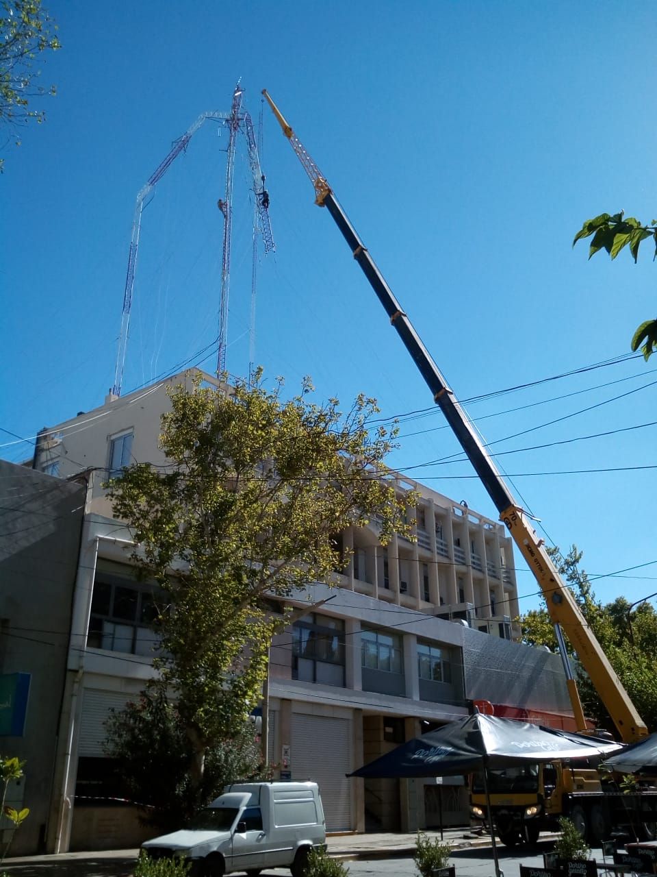 Alfredo Nardi, titular de Protección Civil, le comentó a DIARIO DE CUYO que “el operativo para quitar la antena contó con 8 trabajadores y se extenderá hasta las 20:30 aproximadamente. Desde la Dirección pusimos el marco para que sea en forma segura pero quienes están a cargo de los gastos son los dueños del edificio. La empresa de grúas contratada es privada”.