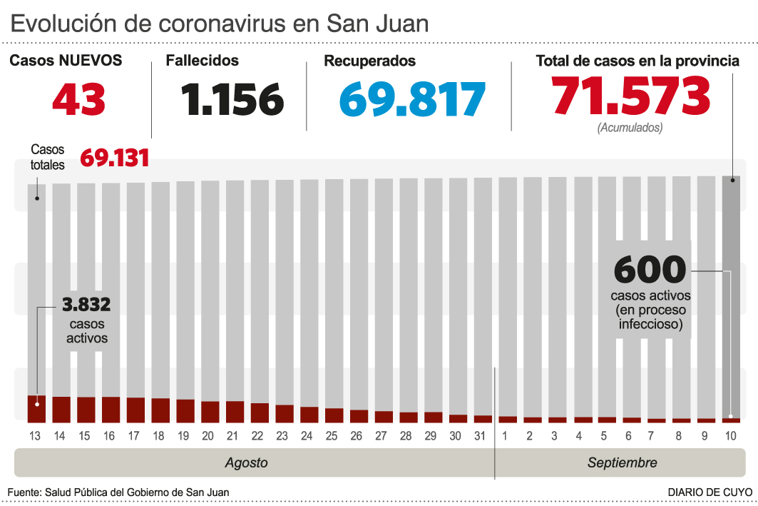 De acuerdo al Ministerio de Salud Pública ayer fue reportado un nuevo deceso por covid. Es una mujer de 65 años, quien vivía en Rawson y permanecía internada en el hospital Guillermo Rawson. Si bien no deja de ser una dolorosa noticia cada muerte, es cierto que nuevamente hubo apenas un fallecimiento diario vinculado a la pandemia, por lo tanto se va manifestando un freno en estas estadísticas. De esta manera, el total de decesos en la provincia ahora es de 1.156.