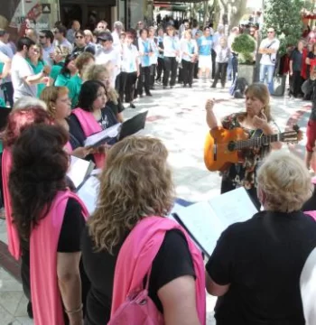 El cruce de las peatonales, en el microcentro sanjuanino, se transformó ayer en el escenario de un espectáculo de coros. En un mediodía casi veraniego, varias agrupaciones corales de la tercera edad, de distintos rincones de San Juan hicieron una ‘cantata callejera‘ y se robaron cientos de aplausos de la gente que paseaba por la zona. Esto, en el marco de la edición 2014 del ’Viví cantando San Juan‘, un encuentro de coros.