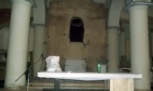 Mientras tanto, esta iglesia sigue cerrada para el público (ver a parte), sin santos y con peligro inminente de derrumbe. Sólo entran al lugar los obreros que se están encargando de desarmar el altar principal y los 2 laterales, preparando el lugar para la futura reparación.