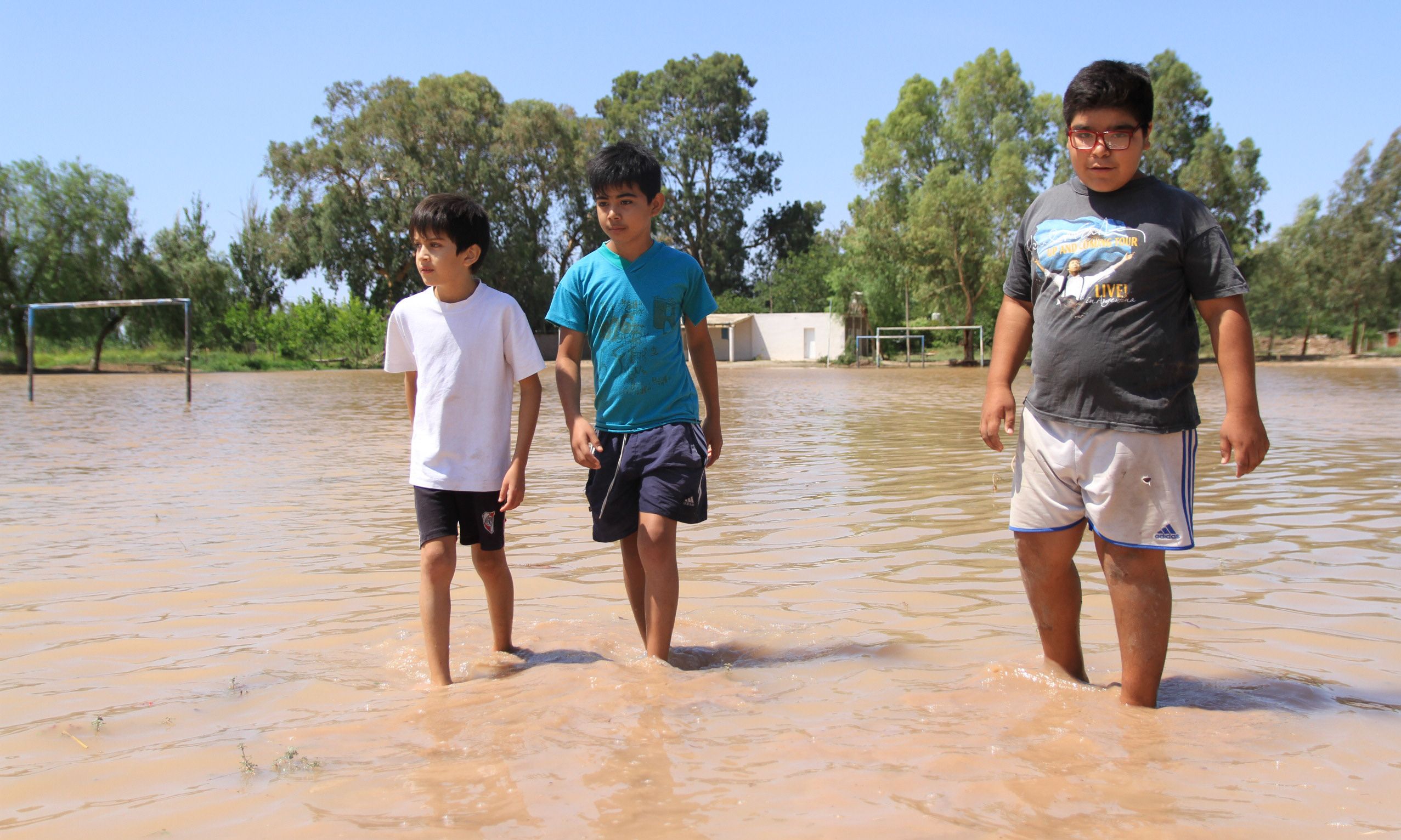 Todo inundado. Los chicos quisieron jugar al fútbol en la cancha del Club Estrella de Las Piedritas, pero no pudieron porque estaba inundado.