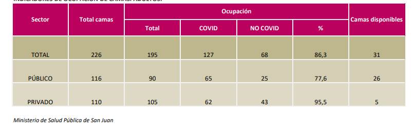 Actualmente, hay 262 pacientes en las áreas de COVID-19 (entre positivos y sospechosos) de los hospitales Dr. Guillermo Rawson; Dr. Marcial Quiroga; Dr. Ventura Lloveras, de Sarmiento; Dr. César Aguilar, de Caucete; Dr. José Giordano, de Albardón; Dr. Federico Cantoni, de Pocito; CEMEC; Dra. Julieta Lanteri; Hospital San Roque, de Jáchal; Hospital Dr. Alejandro Albarracín, de Valle Fértil; Hospital de Barreal, de Calingasta; Hospital Privado; Instituto Médico; Clínica El Castaño; Clínica Santa Clara; Sanatorio San Juan y CCI.