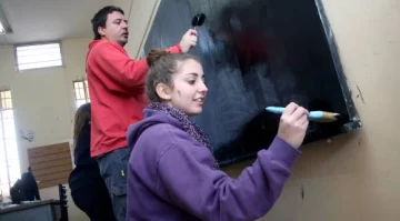 Aprovechando el receso escolar, los jóvenes que pertenecen a una agrupación política empezaron su tarea cerca de las 9. Concentrados, algunos lijaron las paredes mientras que otros pusieron enduido en las partes más deterioradas. Y en botellas cortadas, los más expertos prepararon la pintura que compraron de sus bolsillos. ’Le damos sólo una mano a cada pizarrón porque la pintura está bien pura’, dijo David, que además explicó que algunos materiales fueron pagados por la Cooperadora de la Escuela. No les importó mancharse las manos y la ropa. Es por esto que entre charlas, mates y facturas los jóvenes, algunos ex alumnos de la escuela, pintaron 15 pizarras.