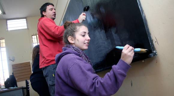 ‘Una de las cosas más lindas que tienen esta jornadas es que además de ayudar pasamos momentos inolvidables’, dijo María de los Angeles. La joven es una de los 20 chicos que con ayuda de las autoridades de la Escuela Amable Jones, de Santa Lucía, pintaron 15 pizarrones como acción solidaria.