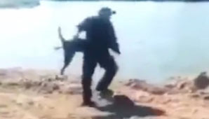Un hombre decidió tirar a su perro al río de forma violenta. Tomó envíon como si fuera a hacer un lanzamiento de bala pero todo le salió mal. Video.