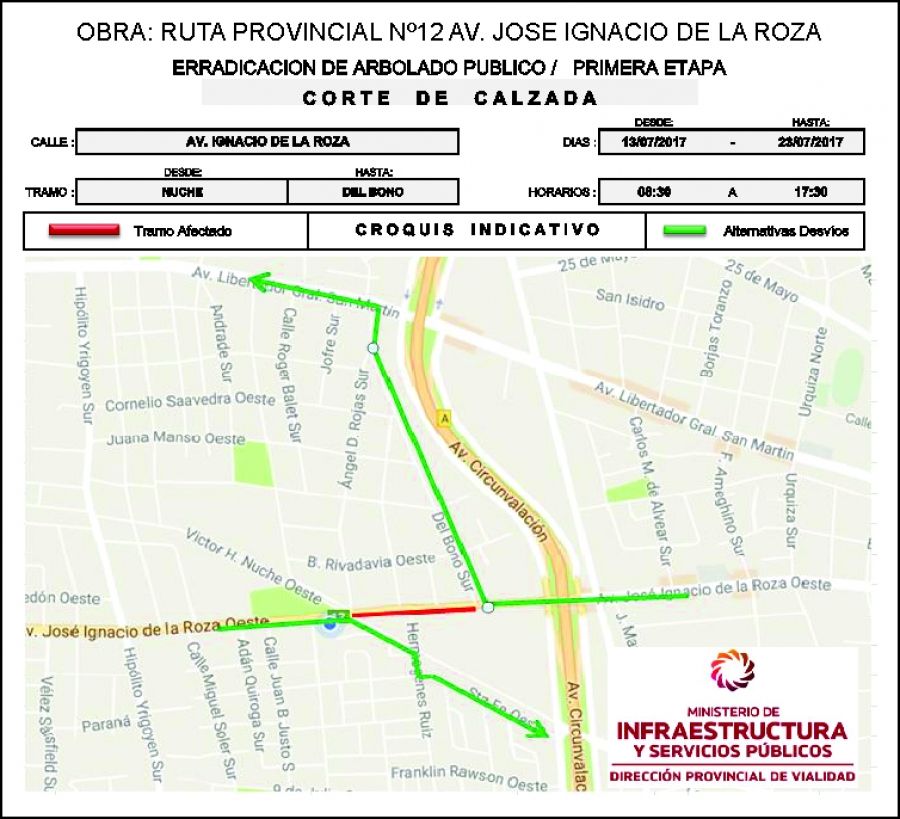 La Dirección Provincial de Vialidad informó sobre un corte en la Avenida Central desde el jueves 13 hasta el domingo 23 debido a la erradicación de árboles que se realizará en la vía pública.