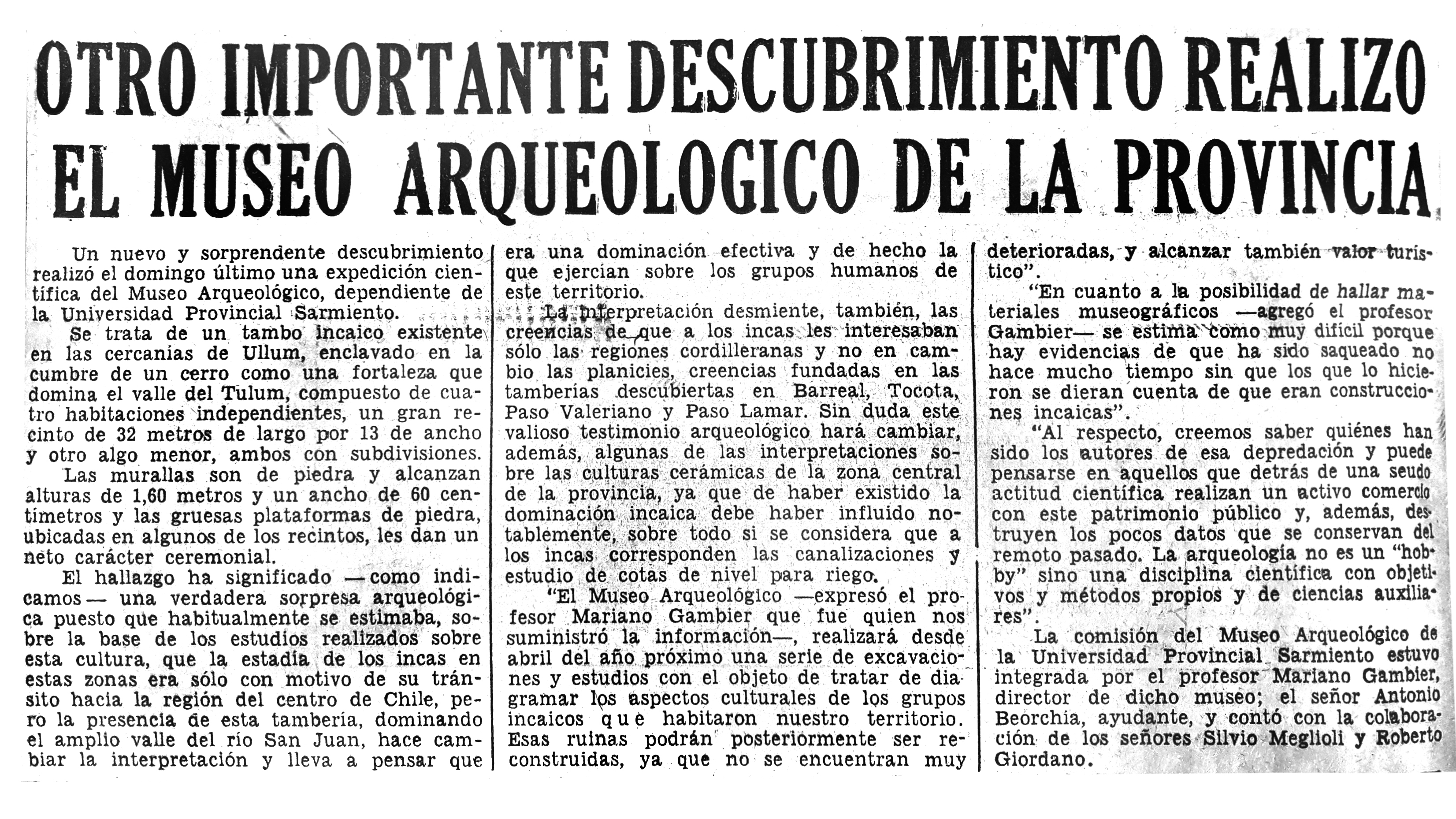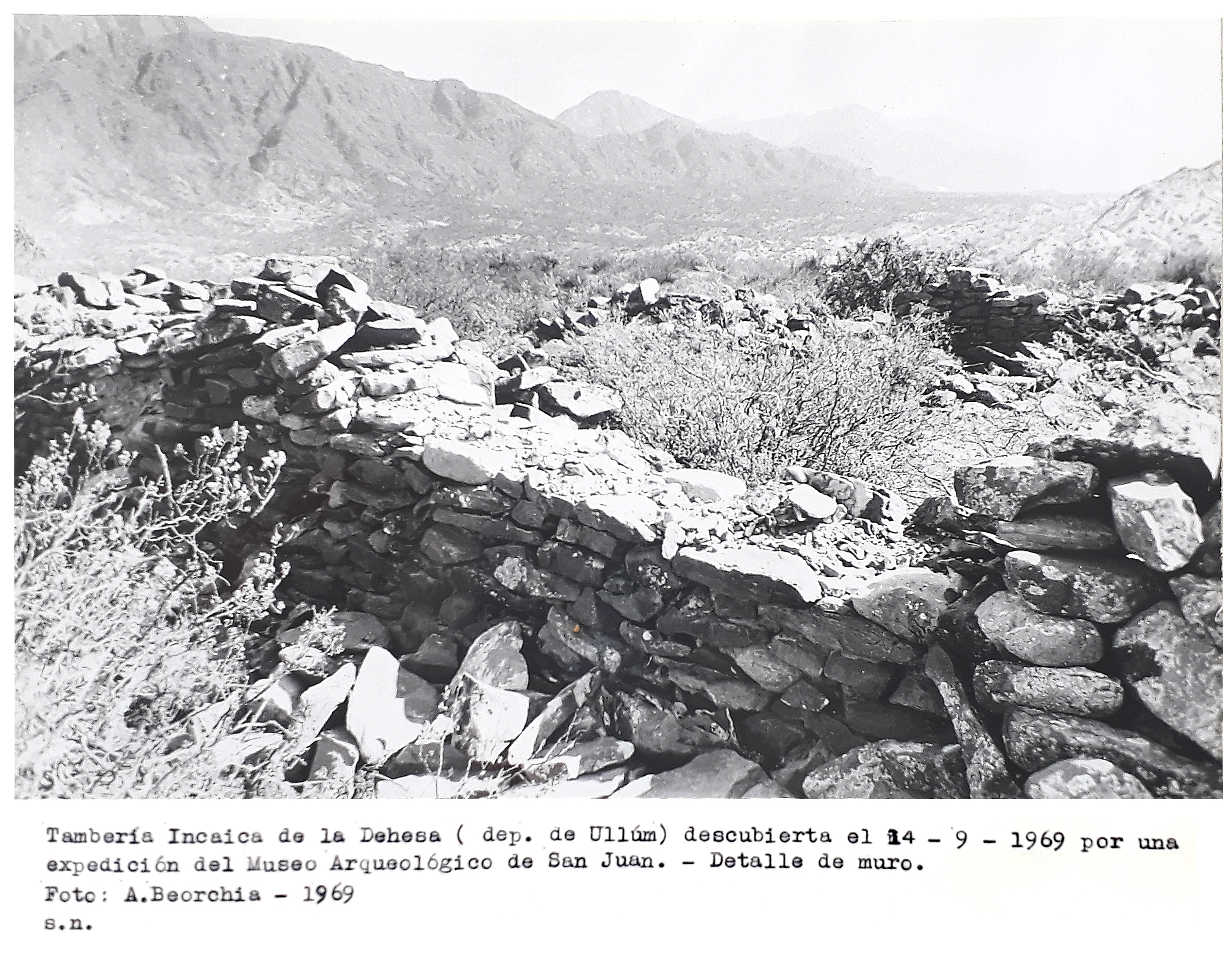 Hace exactamente 50 años, científicos e investigadores del Museo Arqueológico de la Universidad Provincial Sarmiento y algunos amigos del Club Andino Mercedario, en una de sus tantas expediciones a regiones desérticas de San Juan, descubrían en La Dehesa o Punta del Agua, en el departamento Ullum, un ‘tambo‘. El equipo de arqueólogos integrado por el profesor Mariano Gambier, Antonio Beorchia Nigris, Silvio Meglioli y Roberto Giordano encontraba las ruinas de una de las más importantes estaciones de correo inca de Cuyo. Fue un hallazgo decisivo que partió la historia en dos, ya que ayudó a demostrar la presencia del Camino del Inca en la provincia.
