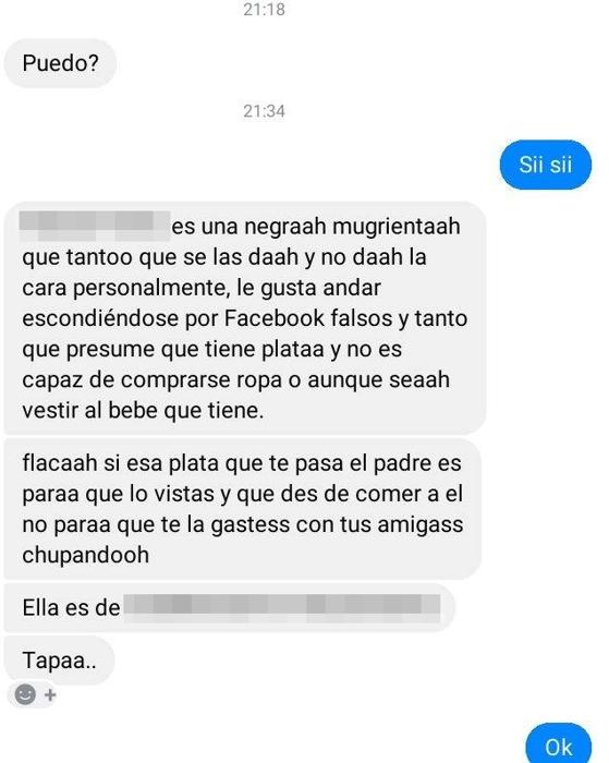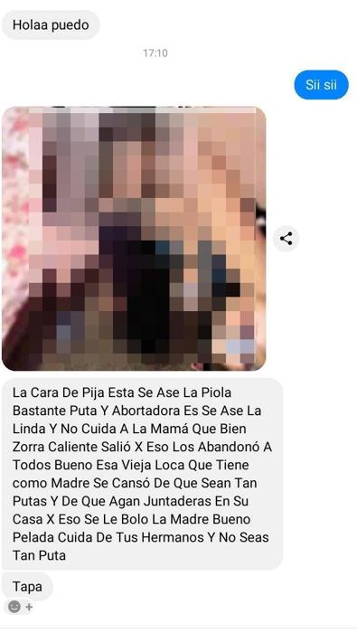 Los mensajes que se publican en Facebook son violentos, discriminatorios, pero, sobre todo, se refieren a la instancia privada de las personas que en esta red social quedan expuestos. Uno de los blancos es señalar a menores a las que tildan de “pu…” o mujeres más grandes a las que se refieren como “viejas gatos”.