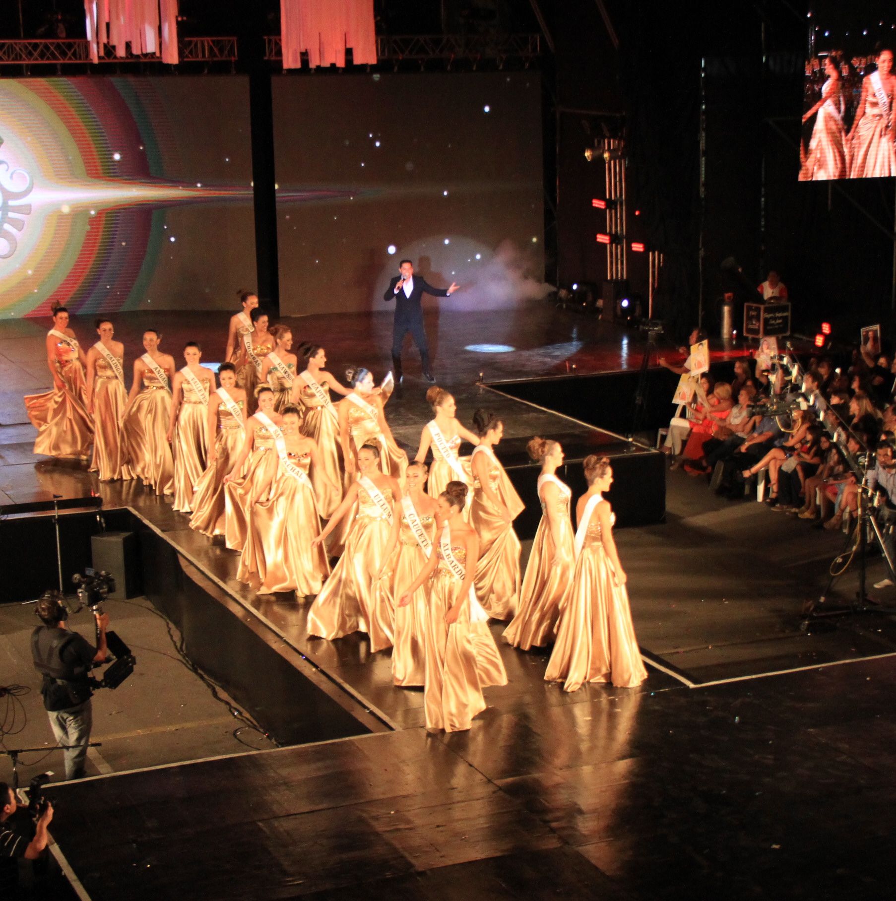 Con vestidos blancos y ante una multitud las 19 candidatas a Reina del Sol de 2014 se lucieron en el anfiteatro del Auditorio Juan Victoria. También subieron al escenario las reinas salientes de ese momento.