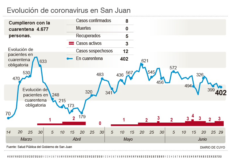 El parte de ayer también dio a conocer que hay 12 casos sospechosos, en tanto que 298 test dieron como resultado negativo y siguen siendo tres los casos activos en la provincia. En cuanto a los repatriados que se encuentran haciendo cuarentena son 402, mientras que 4.677 ya cumplieron con el aislamiento.