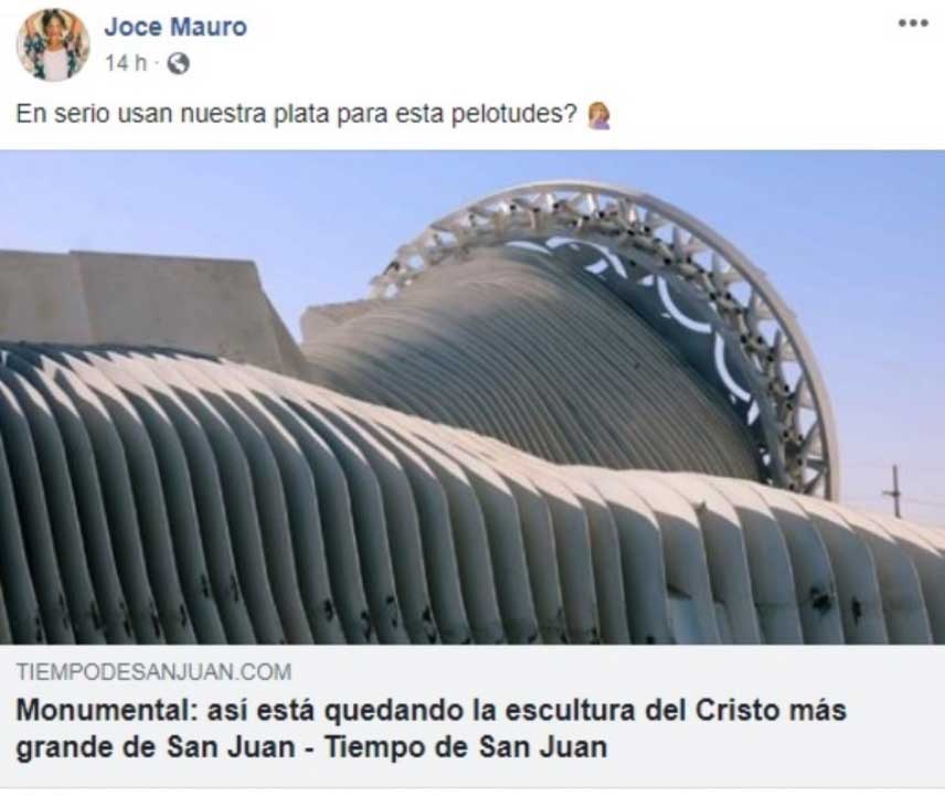 La Reina del Sol, Jocelyn Mauro, utilizó su cuenta de Facebook para criticar una mega escultura que se está levantando en Calingasta y que promete ser un ícono del turismo religioso de aquel departamento.