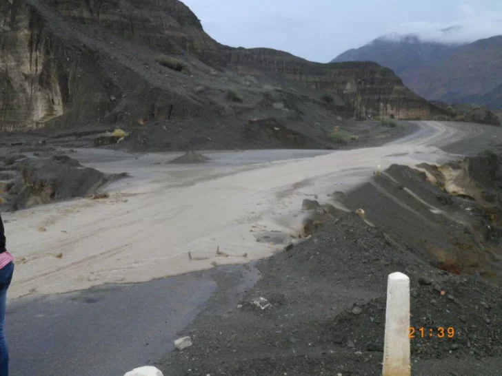 San Juan, 20 de febrero.- Tras las crecidas del río ocasionados por la lluvia de ayer, sigue cortado el tramo de Ruta 40 que une la ciudad de Jáchal con la localidad de Huaco.