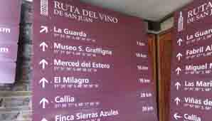 San Juan, 4 de septiembre.- El Ministerio de Turismo y Cultura junto a las bodegas integrantes de la Ruta del Vino, presentaron en la mañana de hoy nueva cartelería que se colocará en calles sanjuaninas como ayuda al turista. Los carteles contienen información variada, como el logo de la ruta, nombre de la bodega y distancia hasta la bodega, y el dato sobresaliente, son las coordenadas de GPS. Esto le permitirá al conductor, pararse, tomar esos datos y llegar de manera correcta hasta el lugar. Además, contiene la frase, "Si tomó alcohol no conduzca", ayudando a que la gente tome conciencia. Por otro lado se mostró el nuevo diseño de la página web y folletería renovada.