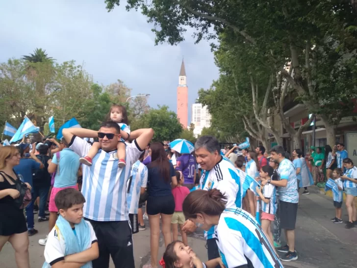 Un grupo de niño decidió subirse a los hombros de sus padres para poder apreciar mejor el pogo que habían generado algunos mientras que otras personas sostenían con firmeza a sus mascotas que también estaban lookeadas con los colores albicelestes. Así se vivió la celebración argentina.