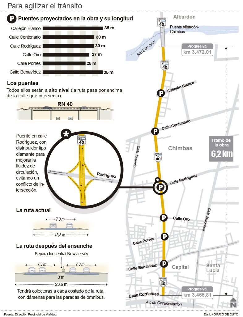 El tramo de la doble vía entre calle Corrientes y el puente de Albardón contempla un ensanche de la ruta de los actuales 7,3 metros a 23,6 metros, además de construir puentes en cruces claves como Benavídez, Porres, Oro, Rodríguez, Centenario y Callejón Blanco.