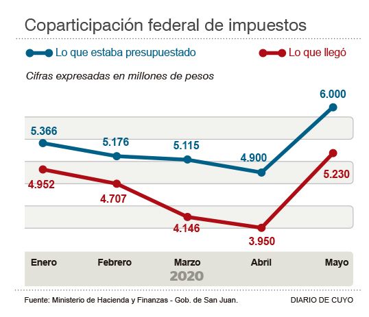 Respecto a los recursos que llegan por la coparticipación federal de impuestos, la funcionaria uñaquista explicó que dentro del presupuesto provincial, que se conformó a finales del año pasado, el Ejecutivo había proyectado recibir en mayo unos 6.000 millones de pesos. Pero estimaban que por la caída de la actividad económica, producto de la cuarentena originada por la pandemia, esos fondos iban a presentar una baja considerable para mayo, estimada entre 1.800 millones y 2.400 millones de pesos. En realidad, la reducción fue sólo de unos 770 millones. El repunte se dio debido a que la administración de Alberto Fernández había decidido postergar hasta el 30 del mes pasado el vencimiento de Ganancias, pago que impactó positivamente en las arcas locales (Ver infografía).