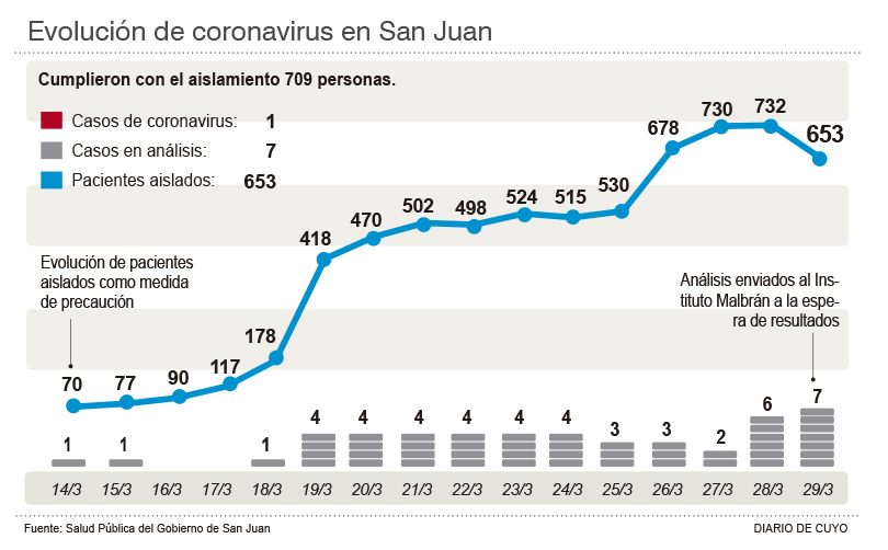 La chica de 29 años continúa en buen estado de salud y sigue siendo el único caso en San Juan según el parte oficial de ayer, aunque se sumó un nuevo caso sospechoso que ya se encuentra en estudio en el Instituto Malbrán (de esta manera los casos a la espera de resultados son siete). Además, hay 653 pacientes que se encuentran aislados por prevención y 709 ya cumplieron con el periodo estipulado por las autoridades.