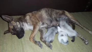 San Juan, 16 de abril.- La imagen conmueve y sorprende. India es una perrita de 3 años que fue rescatada hace un par de meses en Zonda, preñada, a punto de parir. Llegó a su nueva casa, donde la alimentaron, cuidaron y le dieron mucho amor. Allí tuvo a sus nueve cachorritos, dos de ellos murieron y los otros fueron dados en adopción.