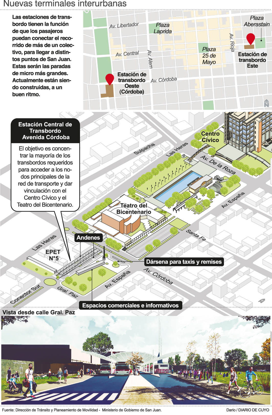 La provincia se sigue preparando para el funcionamiento de la Red Tulum. El nuevo servicio de transporte público de pasajeros iba a dar comienzo 22 de febrero pasado, pero se retrasó debido a que las terminales de transbordo no estaban finalizadas. Ahora parece que falta menos para que esto suceda. Las terminales de transbordo tienen la función de que los pasajeros puedan conectar un recorrido con otro para llegar a distintos puntos de la provincia. Son una de las características más llamativas de la nueva red. Las estaciones están en dos rincones de Capital. Una de ellas, en calle Mitre, entre Jujuy y Aberastain, y la otra, en avenida Córdoba a metros de España (a continuación del Conector Sur). Serán las paradas más importantes de la red y es por esto la imponencia de las obras.