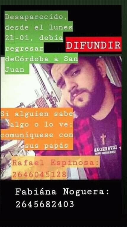 Jonathan Espinosa viajó a Córdoba el 11 de este mes a visitar una amiga y buscar alguna oportunidad laboral, 10 días después le pidió dinero a su papá para volver a San Juan, compró el pasaje, lo devolvió horas después y desapareció.