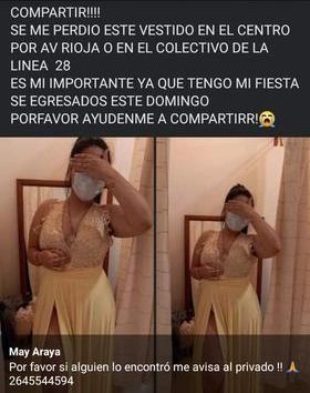 Y explicó que, "el vestido es amarillo pastel y estaba en una bolsa blanca que dice ‘Negra Catinga’". Para finalizar, "pedimos que si alguien lo encontró, por favor se comunique con nosotros al teléfono 264-5544594. Realmente es muy importante para ella".