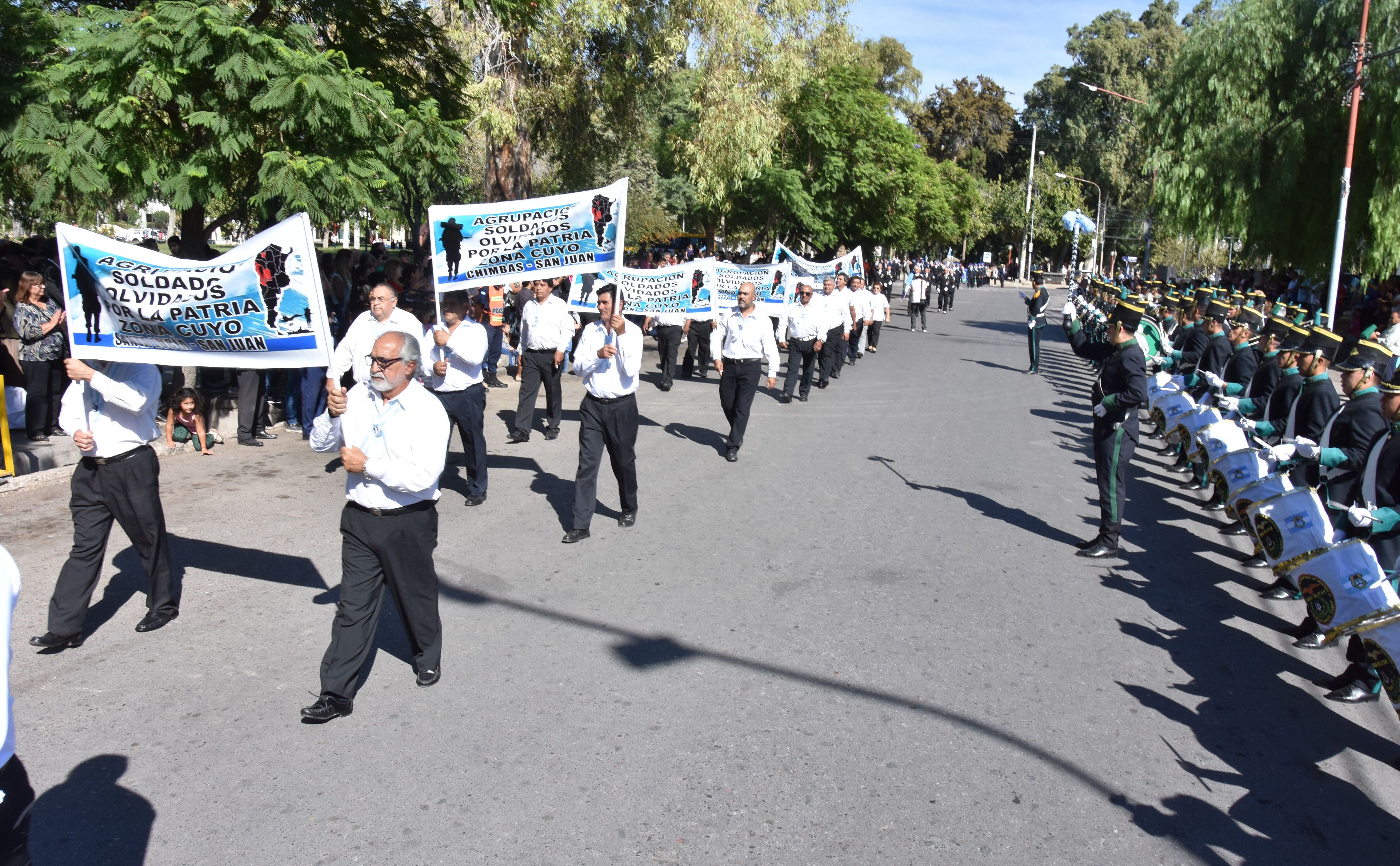 Entre las agrupaciones que desfilaron en calle San luis, en el acto principal, estuvieron ASOP (Agrupación Soldados Olvidados por la Patria), Ex marinos del Canal de Beagle, Asociación Civil Cóndores del Beagle, Ex Combatientes Sanjuaninos y Soldados Bajo Bandera.