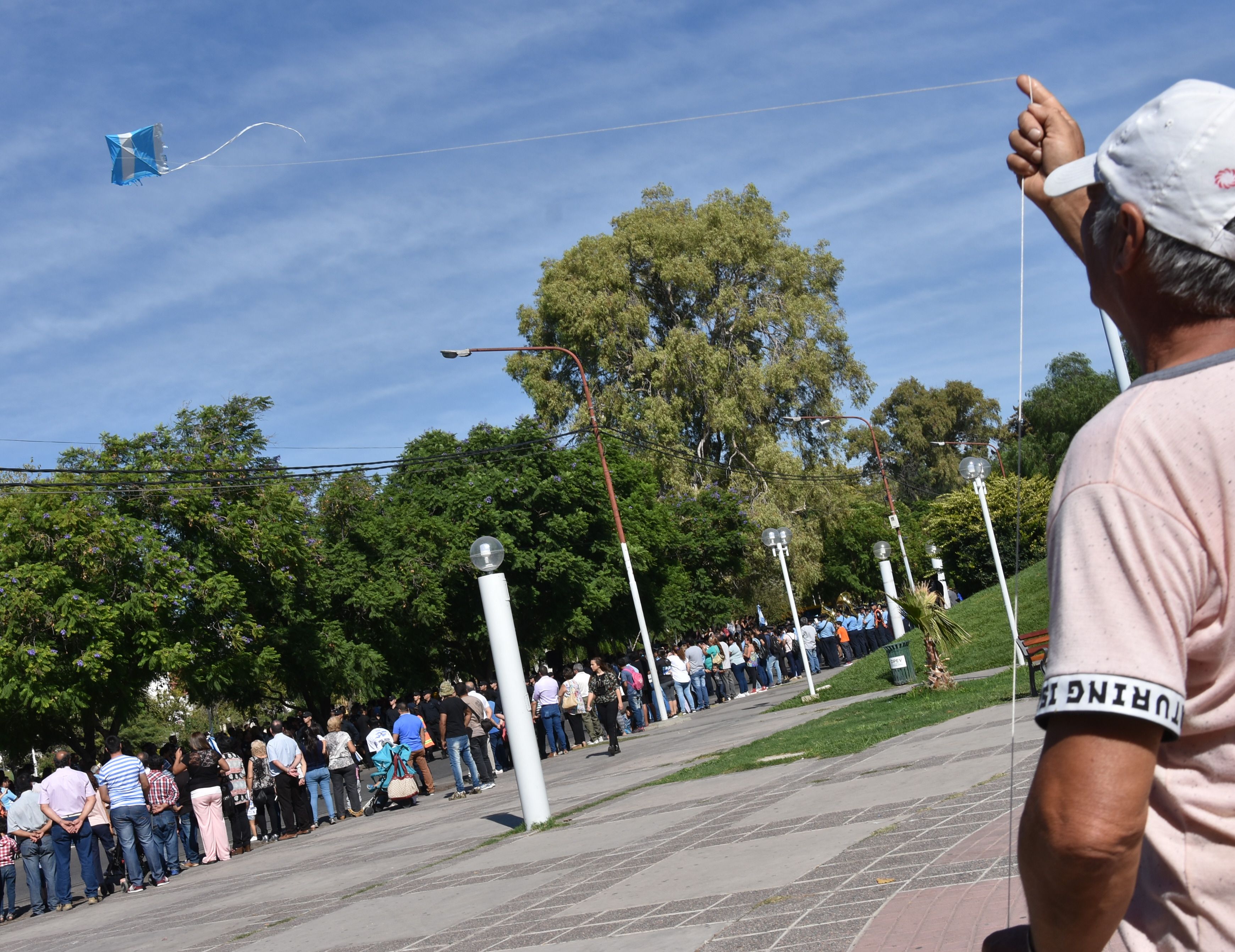 Mientras se desarrollaba el desfile en calle San Luis, entre Las Heras y España, un reconocimiento peculiar se sumó al acto, cuando un barrilete con los colores de la bandera argentina, celeste y blanco, comenzó a sobrevolar el sitio, impulsado por un ciudadano.