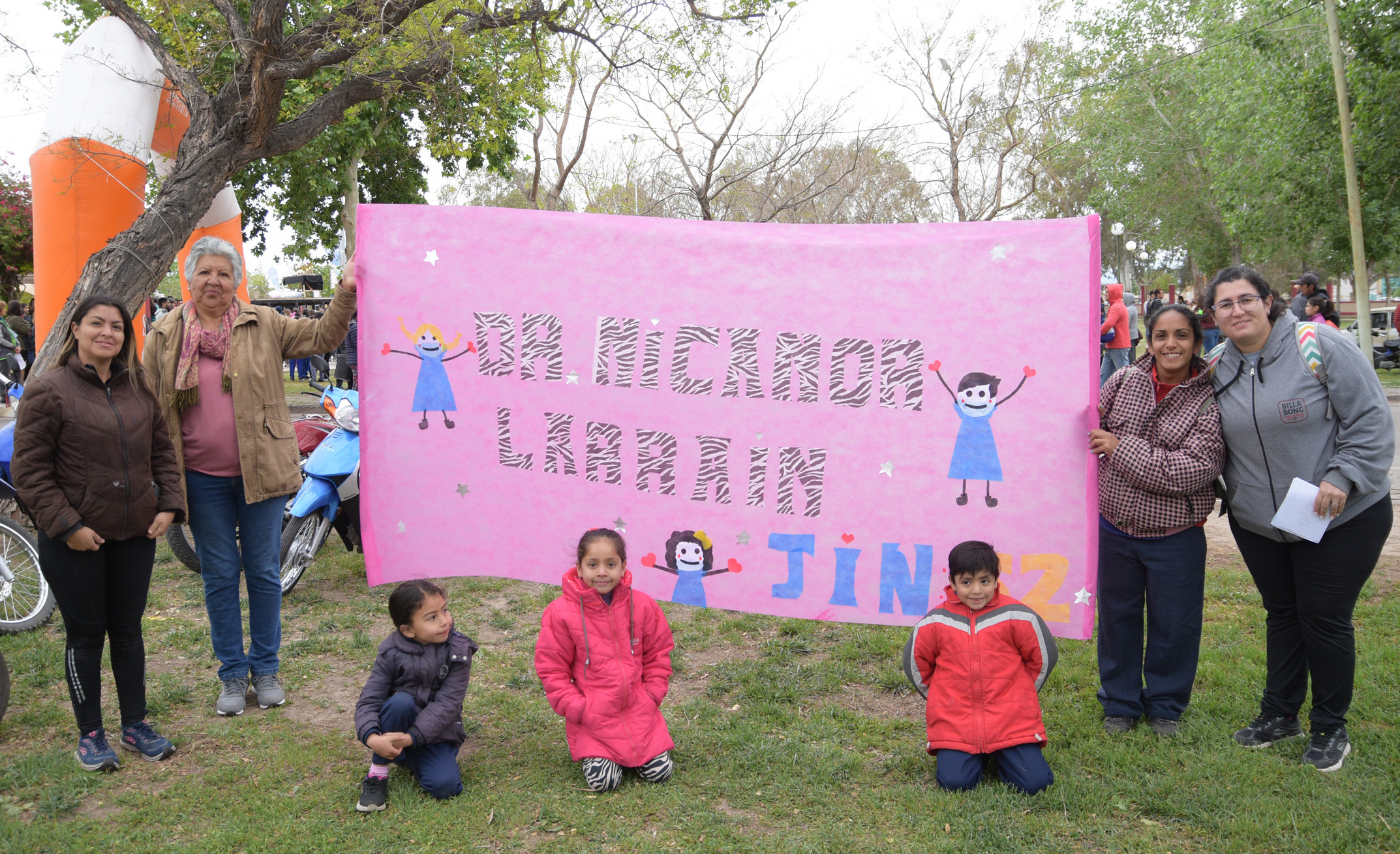 El JINZ Doctor Nicanor Larraín, de Villa Hipódromo, confeccionó una pancarta gigante para hacer notar su presencia en el maratón. Ni bien llegaron al Parque de Rawson la desplegaron para hacerse ver.