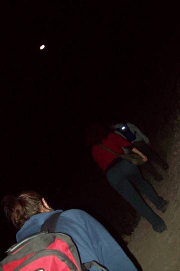A pesar de ser una noche de otoño, la montaña servía de reparo y el clima era más bien cálido detrás de las rocas. La subida demandaba esfuerzo y el camino, toda la atención. La Luna se veía cada vez más grande y más cercana y, en contraposición, el paisaje de abajo comenzaba a hacerse más pequeño y lejano.