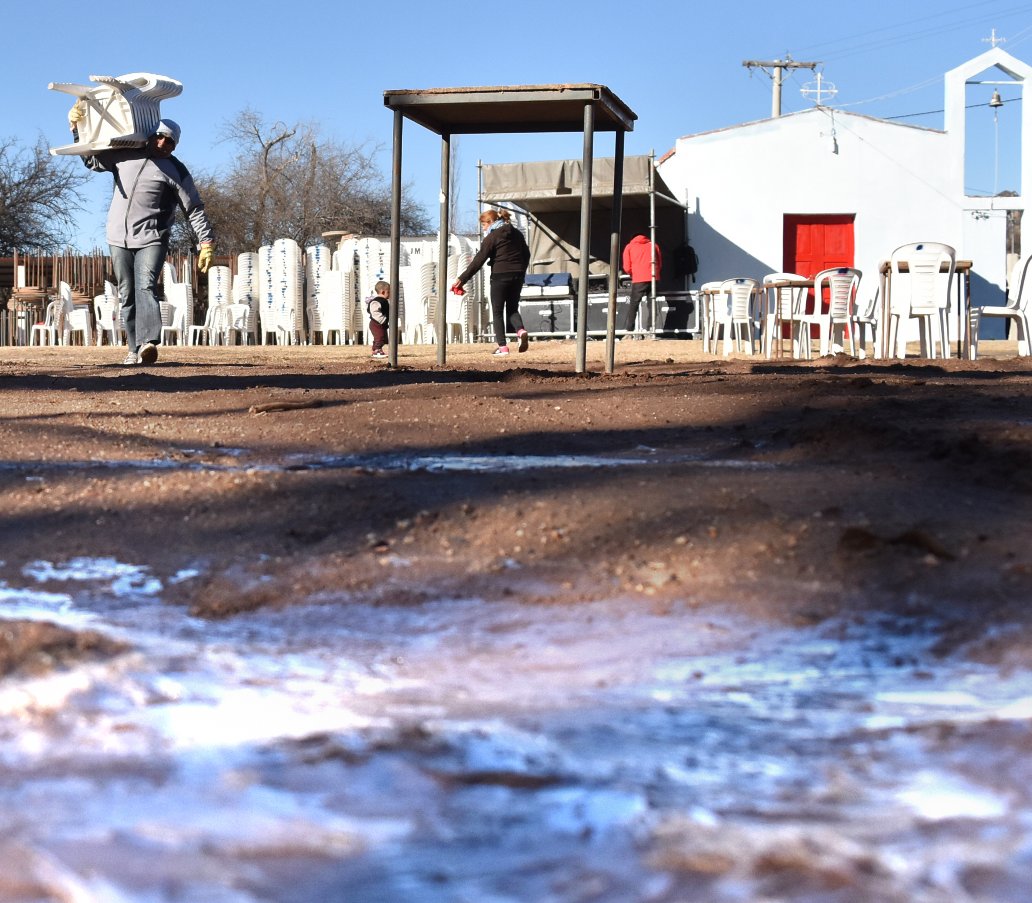 Eran las 11 y los organizadores aún no podían instalar las mesas y sillas en el predio de la parroquia. Es que a esa hora, y a pesar del sol, aún no se derretía la escarcha que cubrió todo el suelo del lugar, tras los 2 grados bajo cero que se registraron durante las primeras horas del día. Esto retrasó el inicio de la fiesta, ya que generó algunas complicaciones. Los turistas que ingresaron primero tuvieron que esperar unos minutos antes de poder ocupar una mesa, aunque no les molestó la espera, ya que aprovecharon el tiempo para tomar fotos del paisaje.