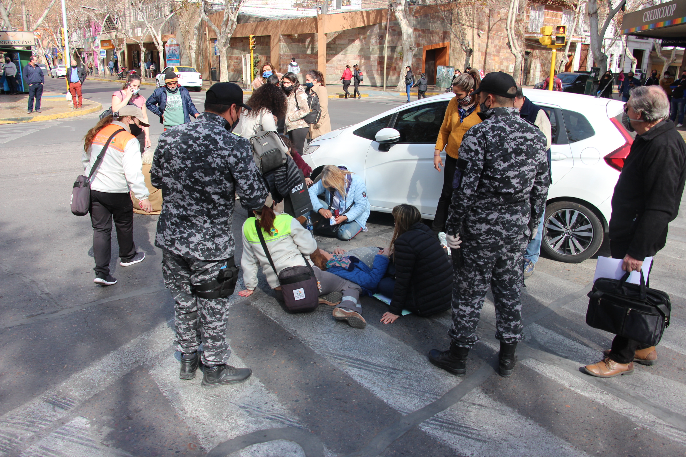 A lo largo de los años distintos accidentes de mayor o menor importancia que involucran a peatones se registran en la esquina de Mendoza y Mitre, a metros del kilómetro 0 de San Juan y frente a la plaza 25 de Mayo. Ayer, un nuevo siniestro en el lugar generó debate y puso en el tapete un viejo reclamo de quienes cruzan la arteria caminando y quedan entrampados en el lugar.