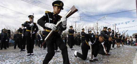 Los cadetes hacían girar sus armas, las llevaban a sus hombros, las bajaban, luego ellos se agachaban y volvían a incorporarse, con precisión y como si la formación fuera un dominó humano, en una acción que hizo delirar a los espectadores.