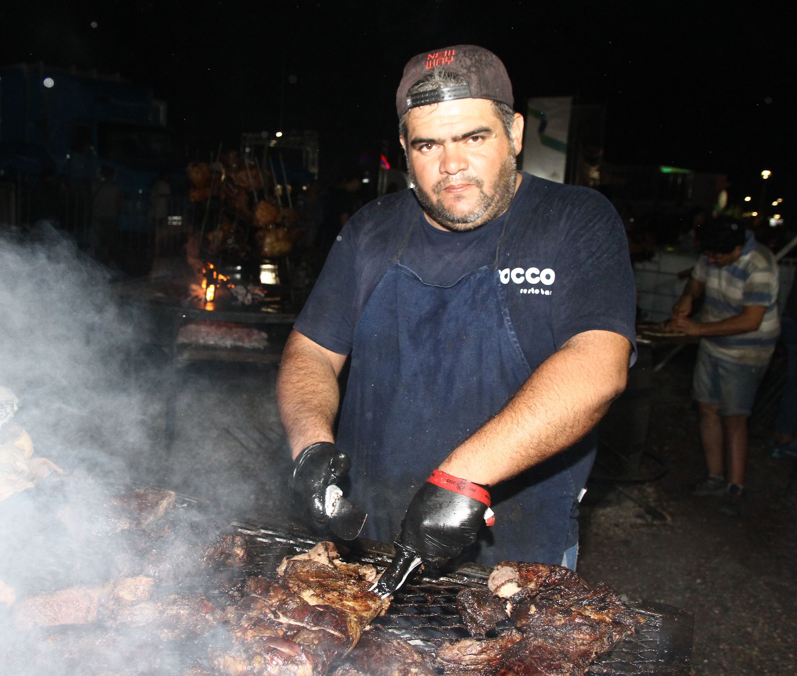 En los puestos de comida hay cientos de cocineros que trabajan sin parar. Uno de ellos es Germán Ahumada, que está en una de las parrillas que hay en los costados del Escenario del Sol. El hombre comentó que arrancan con el fuego cerca de las 16 y que se pasan más de 8 horas preparando comida.
