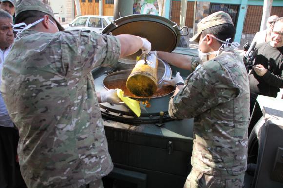 Para preparar el locro multitudinario, que fue trasladado desde Marquesado hasta la Plaza Laprida en dos cocinas del Ejército, hizo falta más de 50 kilos de maíz, y otro tanto de porotos. También usaron unos 150 kilos de carne de vaca y cerdo, además de la panceta, el chorizo, patas de cerdo y cuero, entre otros ingredientes. Los soldados empezaron a preparar el locro el viernes y ayer a las 5 de la madrugada empezó la tarea de cocción. Según contó el cocinero principal del destacamento local, en cada cocina de campaña entran 250 porciones de comida sólida y 500 porciones de líquido.