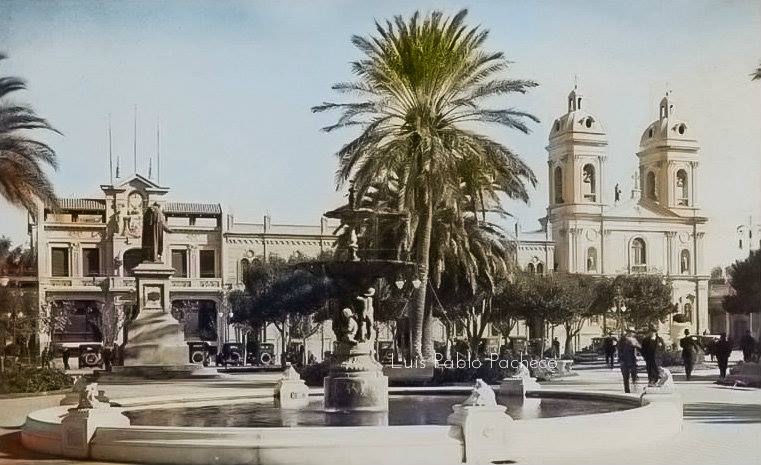 La fotografía, coloreada digitalmente y compartida en el grupo de Facebook “San Juan Antiguo” por Luis Pablo Pacheco, muestra el espacio principal de Ciudad tal como se lo veía en 1920, antes del terremoto de 1944 que obligó a cambiar por completo los edificios que lo rodeaban.