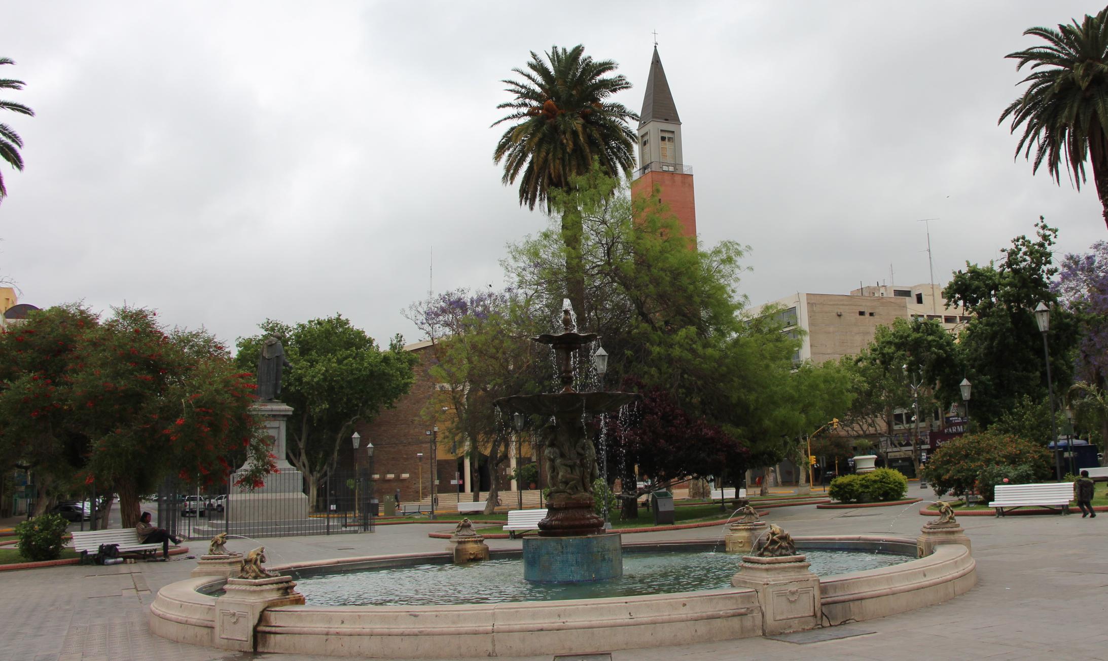 Sin la Avenida Ignacio de la Roza y con la antigua Catedral detrás, la imagen de la plaza 25 de Mayo tomada hace casi 100 años impresiona. Sin embargo, su inconfundible fuente con sapitos y el monumento de Juan Jufré, se muestran como un símbolo inconfundible.