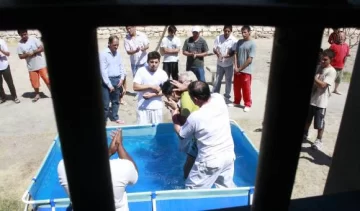 ‘La palabra de Dios te arrastra y te saca de la tumba, porque la cárcel es una tumba. Yo me bautizo para purificarme, para empezar otro camino’, contó Rodolfo Carrizo (34), quien hace 14 meses se encuentra alojado en el pabellón 10 de la Unidad 2, en el Penal de Chimbas. Rodolfo está procesado por tentativa de abuso sexual y dice que en la religión encontró un pilar para salir a flote desde que está preso, por segunda vez. Él fue uno de los 16 internos que se bautizaron dentro del Penal, en una ceremonia que el pastor Osvaldo Vega, de la Iglesia Verbo de Dios del Ministerio Carcelario, repitió luego de casi tres años. DIARIO DE CUYO fue testigo del ritual, que se hizo bajo un sol abrasador y alrededor de una pileta de lona que acunó las aguas bautismales.