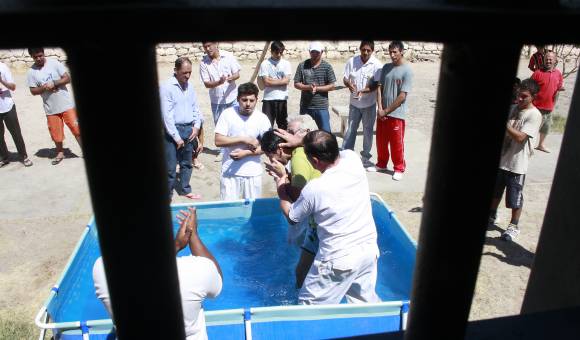Luego, invitados por Núñez, uno a uno los internos dejaron sus zapatillas y entraron a la pileta, donde estaban los pastores Vega y Francisco Sánchez. ‘¿Promete serle fiel a nuestro Señor Jesucristo desde hoy y hasta su venida?’, preguntaba Vega. Y ante la respuesta afirmativa, empujaban la cabeza del interno hacia atrás, hasta que todo el cuerpo quedaba cubierto por el agua. ‘Conforme a su testimonio, yo lo bautizo en nombre del Padre, Hijo y Espíritu Santo’, apuntaba Vega, ante los gritos de ‘gloria a Dios’ y ‘aleluya’ de los presentes.