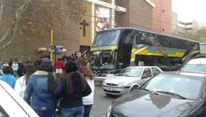 Cientos de familiares de los viajantes se dieron cita en la puerta de la Iglesia Catedral para recibir a los chicos que llegaron cargados de valijas. El importante grupo dificultó el paso de peatones y de vehículos ya que varios estacionaron alrededor de la plaza 25 de Mayo.