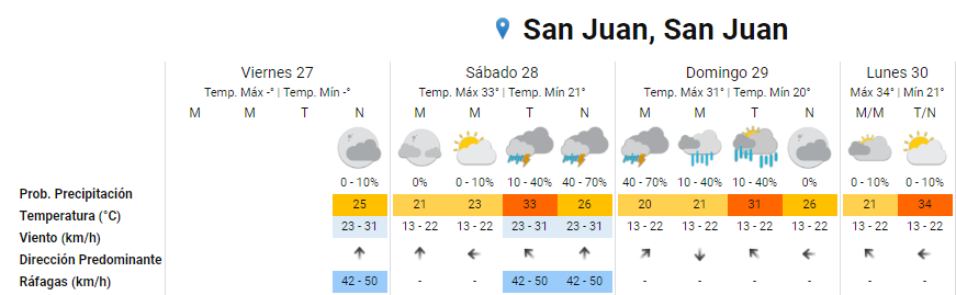 Luego del aguacero que cayó en San Juan durante la madrugada de este viernes, el panorama se presenta similar para el fin de semana, especialmente para la noche de sábado y madrugada del domingo, según el pronóstico del Servicio Meteorológico Nacional (SMN).