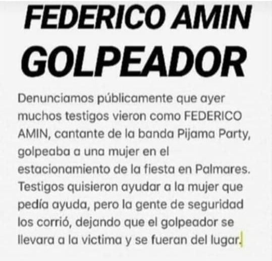 En las últimas horas, Federico Amin, cantante del conocido grupo de cumbia pop Pijama, fue escrachado en las redes sociales por una supuesta agresión que ocurrió en el salón Palmares, ubicado en Chimbas, hacia su novia Josefina Robins.