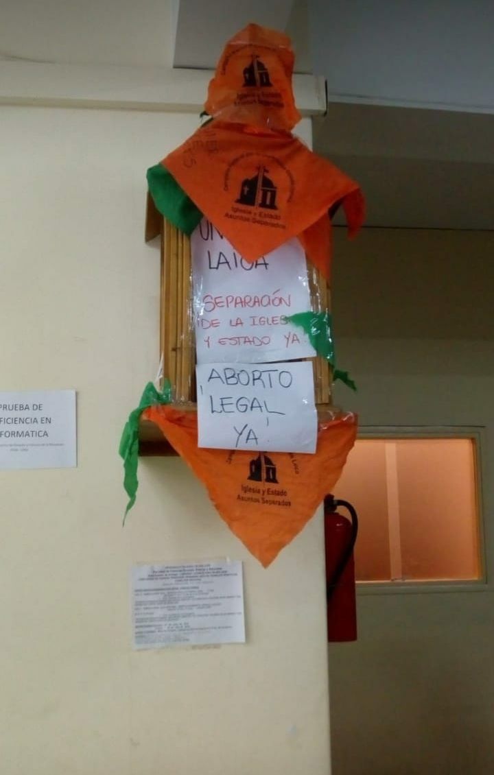 Un grupo de manifestantes dejó la marcha principal y se dirigió al edificio de la Facultad de Filosofía, Humanidades y Artes ubicado en Ignacio de la Roza, entre Sarmiento y Catamarca, para mostrar su descontento con la presencia de una figura de la Virgen María, aduciendo que la universidad es laica.
