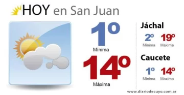 San Juan, 23 de junio.- 14 grados, esa será la temperatura máxima prevista para este martes en la provincia. Según el pronóstico del Servicio Meteorológico Nacional, se esperan ráfagas de viento del sector Noreste.