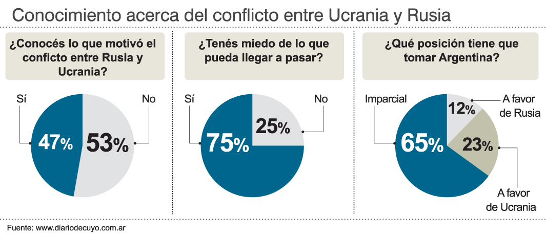 El ataque ruso contra Ucrania fue ayer el tema del día en todo el mundo, incluida la Argentina.Tras este hecho, el Gobierno argentino rechazó "el uso de la fuerza armada" y llamó a Rusia a cesar las acciones militares. Y pidió "diálogo y compromisos mutuos que aseguren la esencial convivencia pacífica". DIARIO DE CUYO quiso conocer la opinión de los sanjuaninos frente a esta realidad y a la postura que debe asumir el país en este enfrentamiento. Si bien la mayoría de los encuestados (el 53% de los lectores y el 90% de los entrevistados en la calle) dijo que desconoce las razones del conflicto entre ambos países (el 47% y el 10% respectivamente dijo que sí conoce los motivos), la gran mayoría de ambos ámbitos sostuvo que la Argentina debe permanecer neutral ante este enfrentamiento. Esta fue la opinión del 65 % de los lectores, frente al 23% que dijo que debe estar a favor de Ucrania y al 12% que eligió el bando de Rusia. A esto se sumó la opinión de la gente en la calle. El 60% eligió la neutralidad, mientras que el 40% dijo que la Argentina debería mediar entre ambas partes para que lleguen a una solución pacífica. Algunos de los encuestados dijeron al respecto que "el mundo ya sufre mucho con el coronavirus como para que ocurra otro hecho que termine con miles de vidas" y que "nuestro país debería mantenerse neutro, más allá de tratados y pactos que éste Gobierno y el anterior y el anterior hayan acordado con Rusia, porque siempre los argentinos sacamos las de perder".