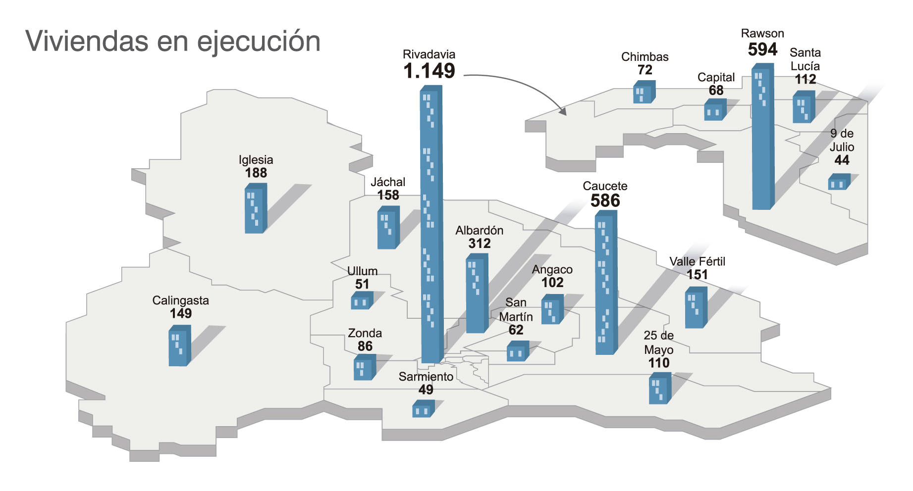 Ni la pandemia ni el terremoto de enero pasado lograron frenar el avance de la construcción de barrios destinados a paliar la necesidad de vivienda en la provincia. Hay 4.137 viviendas en ejecución de las cuales 1.995 (48%) están distribuidas en los 5 departamentos del Gran San Juan. Dentro del total en esta zona, el 57% se concentra en Rivadavia, donde hay 1.149 casas en marcha. Luego le sigue Rawson con 594 casas en obra, y Santa Lucía con 122. Los dos últimos puestos son para Chimbas y Capital, con 72 y 68 viviendas en construcción respectivamente. Marcelo Yornet, director del IPV, sostuvo que la distribución de las mismas se debe principalmente a la necesidad de la gente y no a "algún tipo de privilegio". "No hay privilegios ni cuestiones políticas a la hora de planificar la construcción de un barrio. El IPV sólo tiene en cuenta la necesidad de la gente, basándose en los datos estadísticos, y la disponibilidad de terrenos. En Rivadavia hay muchas casas en ejecución debido a la cantidad de asentamientos, por ejemplo. El gobernador Uñac quiere terminar su gestión con todos los asentamientos de la provincia erradicados y reubicados. Es por eso que también hay otras comunas con muchas viviendas en construcción", dijo el funcionario.