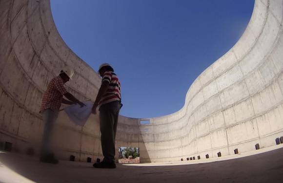 Cada vuelta al cilindro que será el hall principal ocupa 22,5 metros cúbicos de relleno de hormigón, en moldes para encofrar de 120 centímetros de altura. Es, comparativamente, como hacer entre dos o tres losas completas del techo de una casa, de una sola vez. Todo es grande en la obra, todo se agiganta y fundamentalmente, todo está plagado de curvas. El Museo Mundo Dinosaurio, que se levanta en el Predio Ferial, avanza a ritmo sostenido y ya alcanzó el 20%, quizás el porcentaje más dificultoso de llegar por la complejidad de la construcción, conformado por una serie de nueve edificios circulares hechos de hormigón armado.