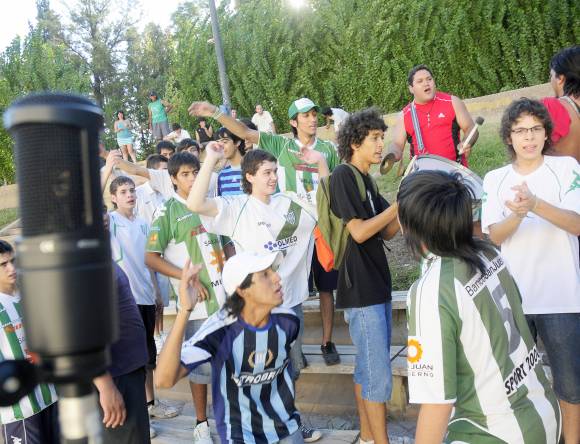 Además del ruido de las sillas, botellas y copas que usará para la banda sonora del cierre de la Fiesta Nacional del Sol, la música del fútbol también estará presente. Es por esto que ayer en la tarde el anfiteatro del auditorio Juan Victoria se convirtió en una especie de tribuna. De verde y blanco, los hinchas de Sportivo Desamparados grabaron con sus instrumentos parte de la música que sonará el próximo sábado en el Autódromo El Zonda.